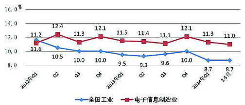 2014年1-5月,規(guī)模以上電子信息制造業(yè)增加值同比增長11.0%,高出工業(yè)平均水平2.3個百分點,但比去年同期和去年年底分別下降0.3和1.1個百分點。實現(xiàn)銷售產(chǎn)值、出口交貨值、內(nèi)銷產(chǎn)值同比分別增長9.0%、3.2%和15.7%,比1-4月分別下降0.6、0.7和0.5個百分點。